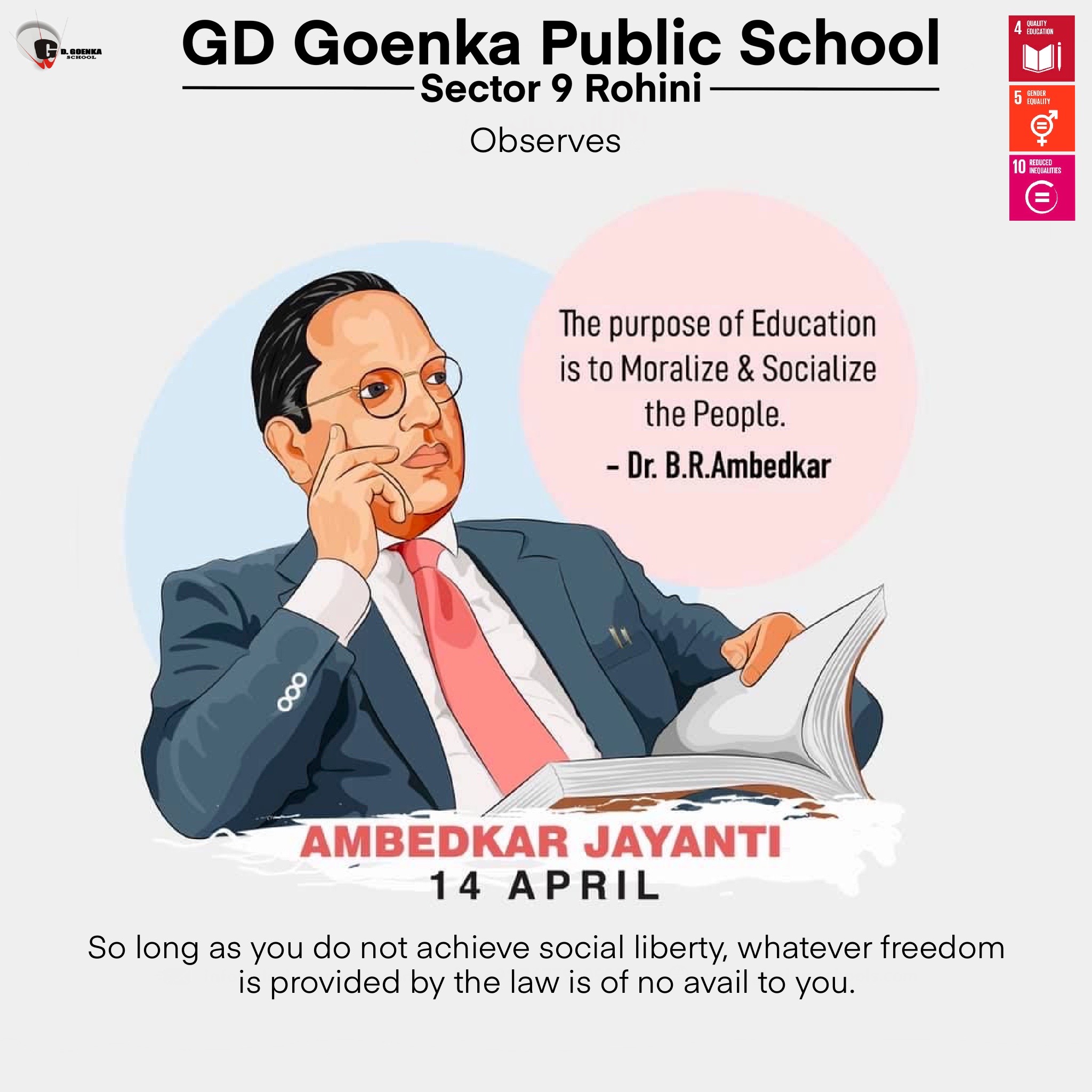 Ambedkar Jayanti or Bhim Jayanti is observed on 14 April to commemorate the memory of B. R. Ambedkar, Indian politician and social reformer. It marks Ambedkar’s birthday who was born on 14 April 1891. His birthday is also referred to as ‘Equality Day’ by some in India. Ambedkar Jayanti processions are carried out by his followers. It is a customary for senior national figures, such as the President, Prime Minister and leaders of major political parties, to pay homage at the statue of Ambedkar at the Parliament of India. Recognised as the first Law and Justice Minister of Independent India, Ambedkar’s contribution to construct the entire concept of Republic of India is immense. To honour his contribution and service to the country, his birthday is celebrated every year on the 14th of April. A principal architect of the Constitution of India, Ambedkar also advocated for women’s rights and labours’ rights. Ambedkar’s philosophy is still relevant to this day. Without Babasaheb’s active role in shaping up India’s socio-cultural system, it would have been nearly impossible to make any progress from dated and archaic beliefs and to the country the world’s biggest democracy. GD Goenka Public School, Rohini, Sector 9, pays tribute to the great soul on his Jayanti.