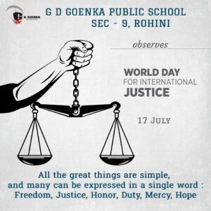 Every year on July 17, World Day for International Justice is observed all around the world. The aim of the day is to promote international criminal justice and as a way of supporting the work of the ICC. Also, this day aims at uniting everyone who wants to support justice as well as promote victims rights. It is to help prevent serious crimes and those that put the peace, security and well-being of the world at risk. To commemorate the establishment of ICC, World Day for International Justice is celebrated with great enthusiasm across certain countries. Certain organisations run drives on this day to ensure people know about some issues of global importance like violence against women, genocide etc. “There is no freedom without justice”- Simon Wiesenthal. On this same note, GD Goenka Public School, sector-9 Rohini, wishes you Happy International Justice Day.